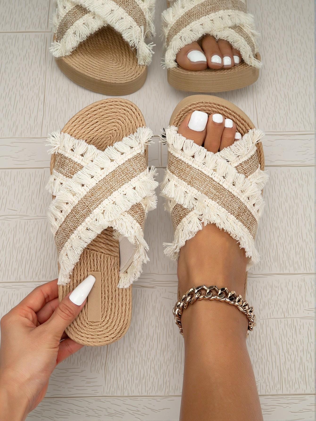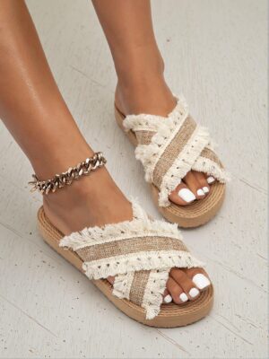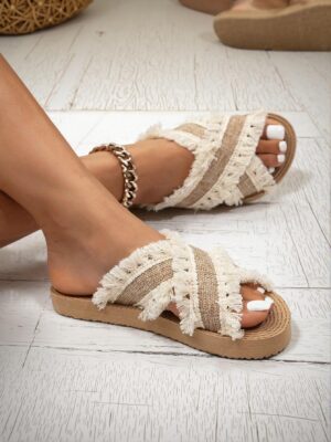 Introducing our Elegant Beige Women Flat Sandals Stylish Bohemian Tasseled Slip-On Beach Slippers Perfect for Summer, Vacation, and Casual Wear – Cute, Comfortable, Aesthetic, Classy, Trendy, Chic, Luxury Sandals For Beach, Holiday, and Spring. These sandals are designed to elevate any summer outfit with their chic bohemian fringe detail, offering both comfort and style ideal for beach outings, holidays, or casual day wear. Slip into these open-toe beauties and enjoy the perfect blend of elegance and laid-back charm.