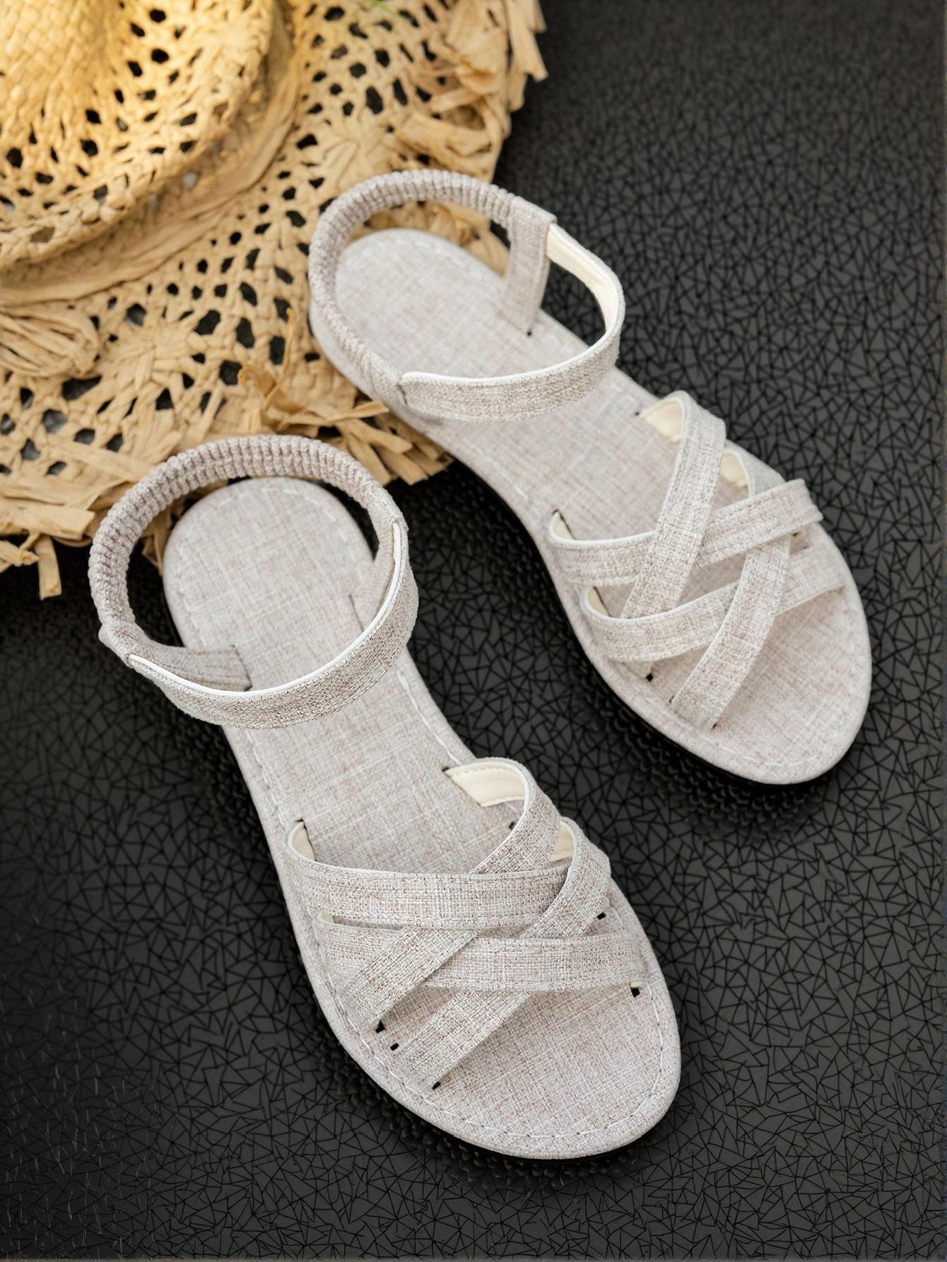Elegant Beige Women Flat Sandals with Cross Adjustable Straps, Versatile and Lightweight Design...