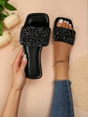 Elegant Black Women Flat Sandals “Chic Plus Size Open Toe Rhinestone Decor Slides, Perfect...