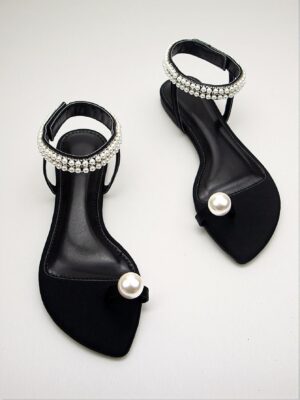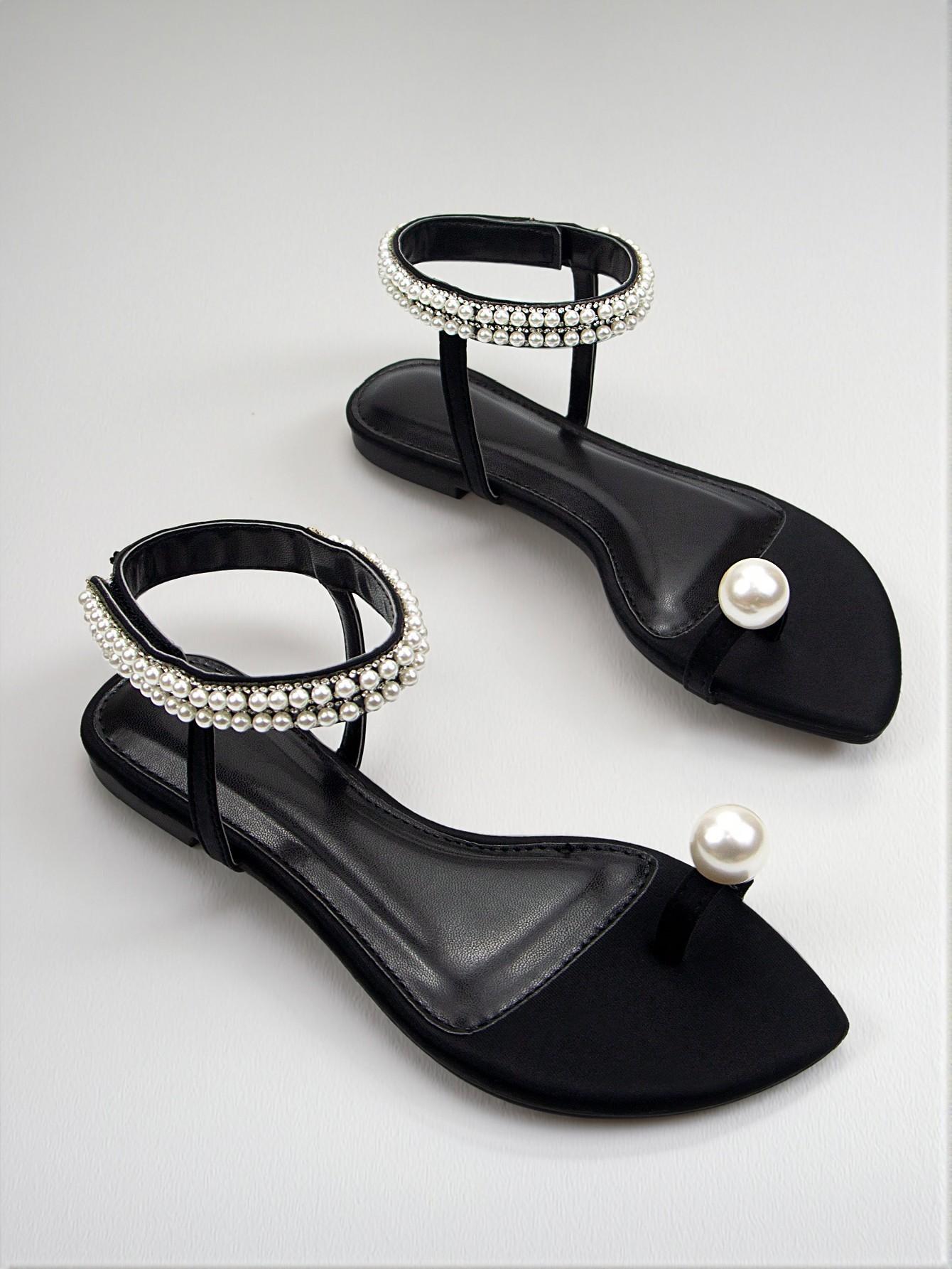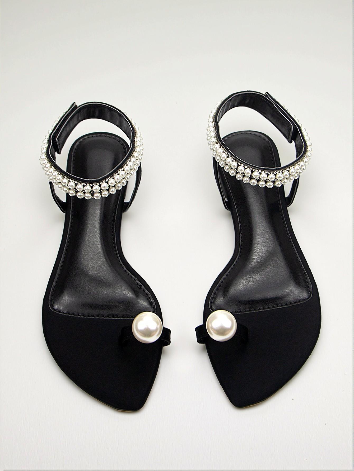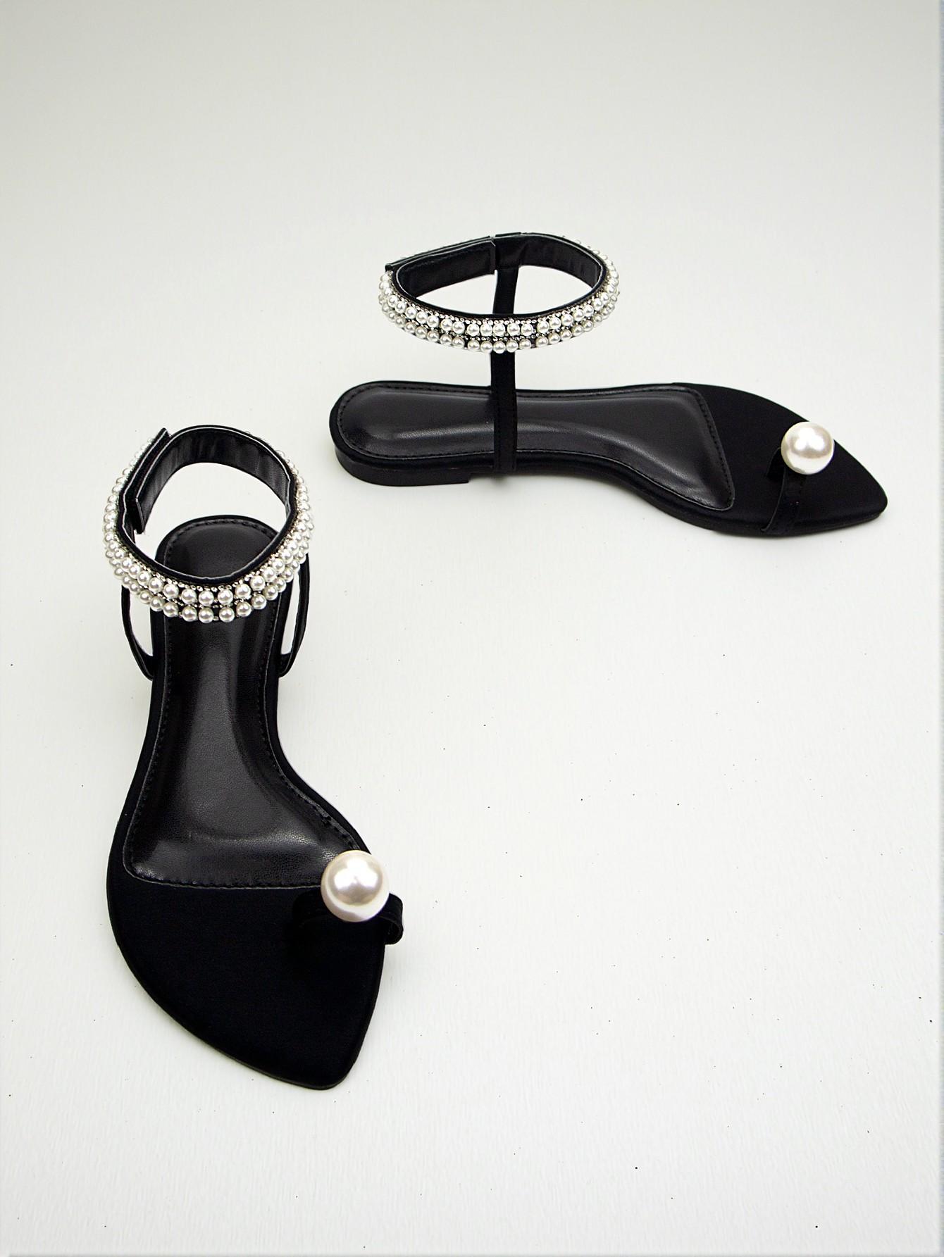 Elegant Black Women Flat Sandals Featuring Pearl and Rhinestone Ankle Strap Design, Chic Heart...