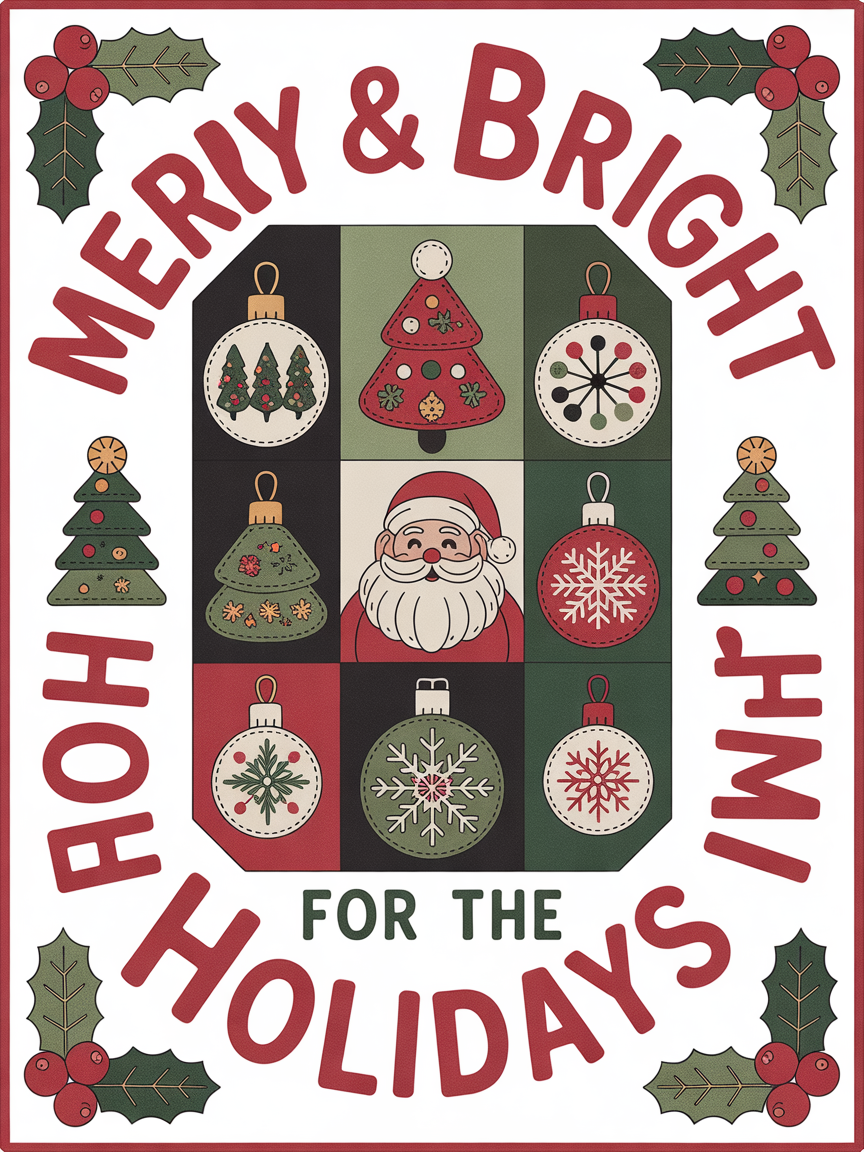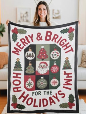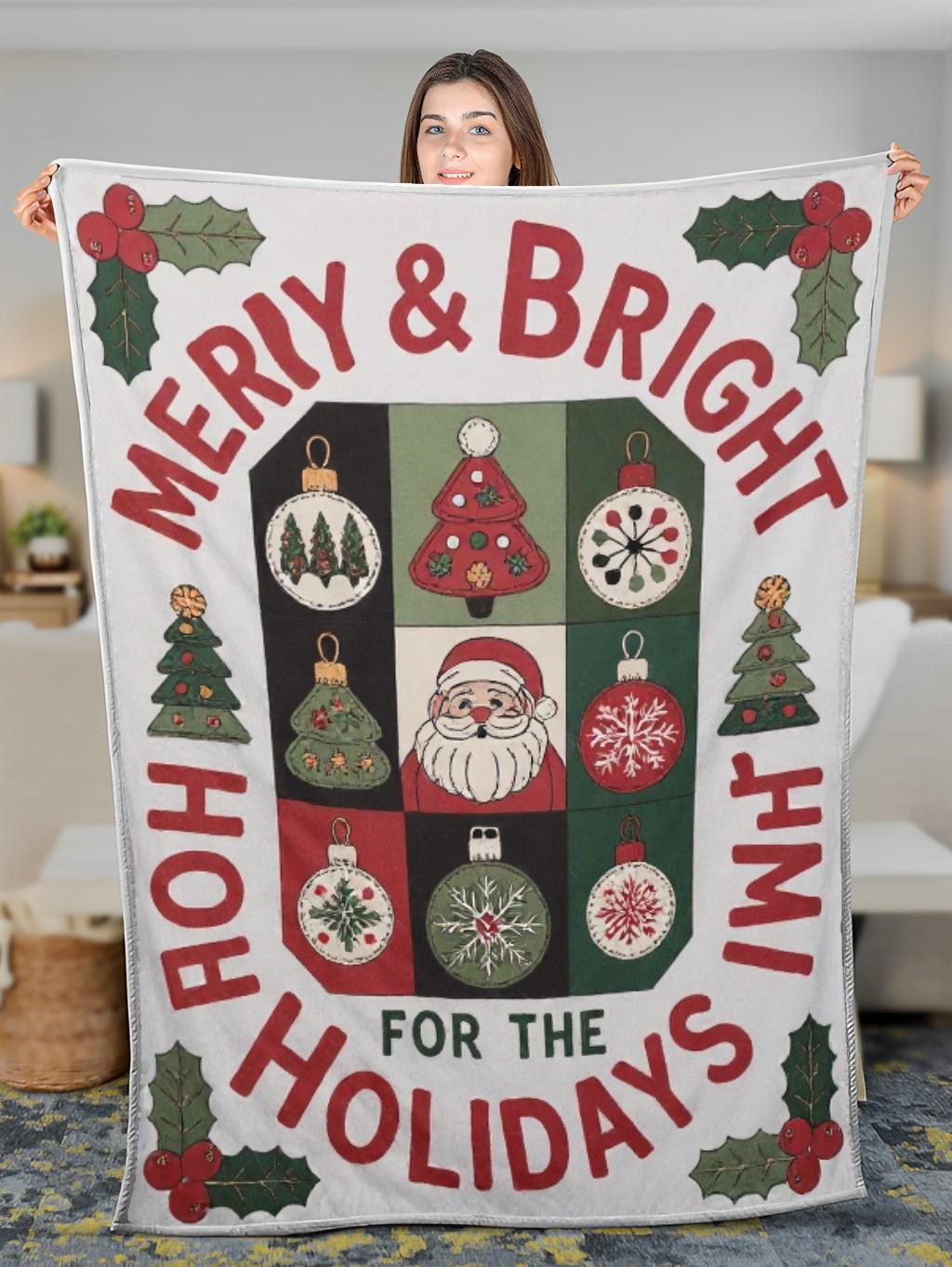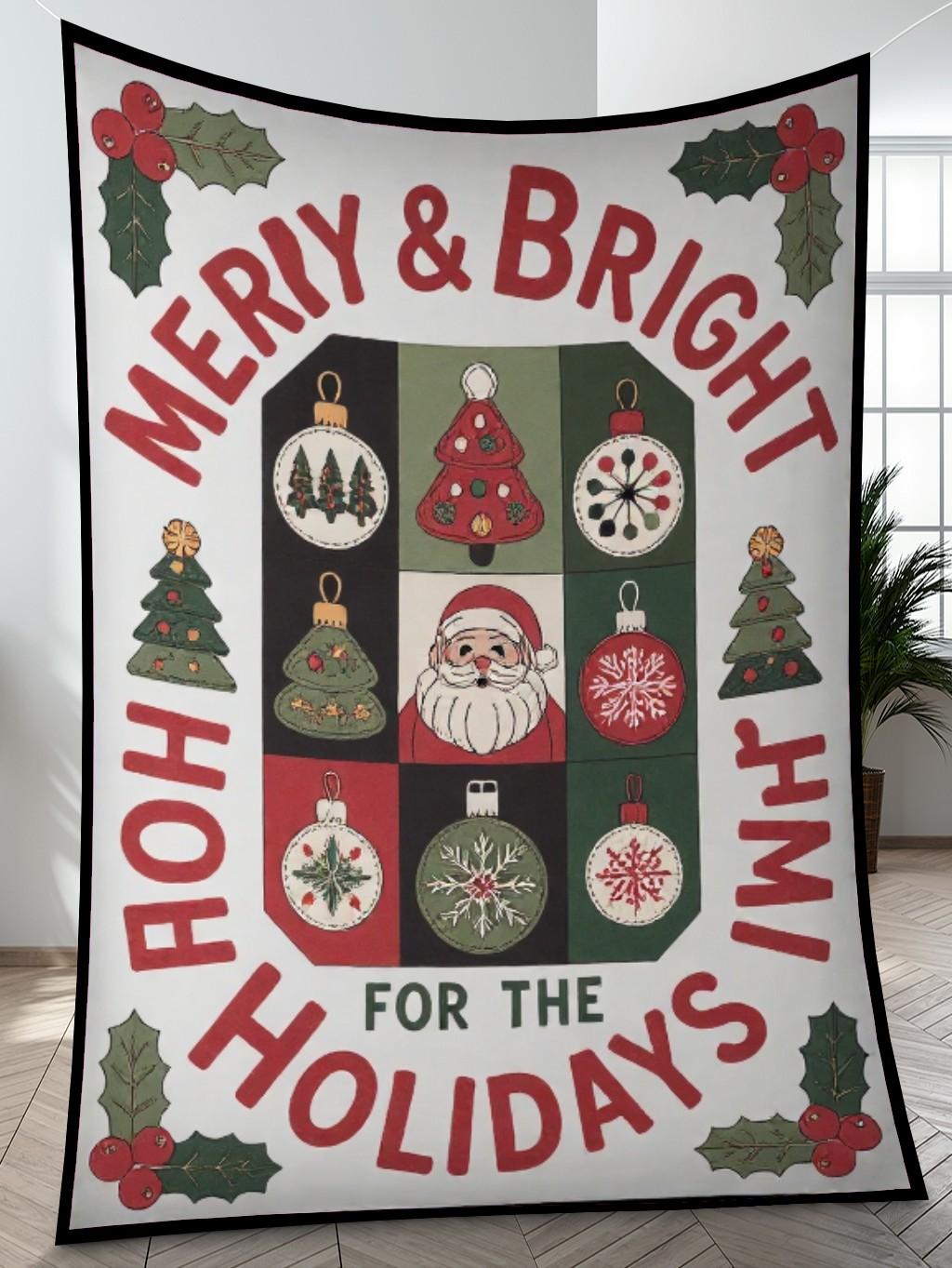 Elegant Christmas Quilted Blanket – Whimsical Tree Ornaments, Festive Holly Berries, Vintage...