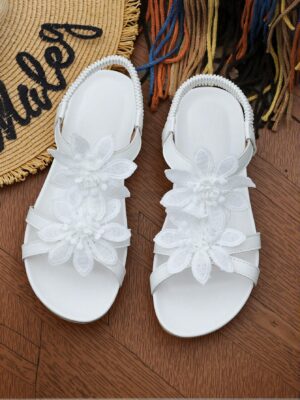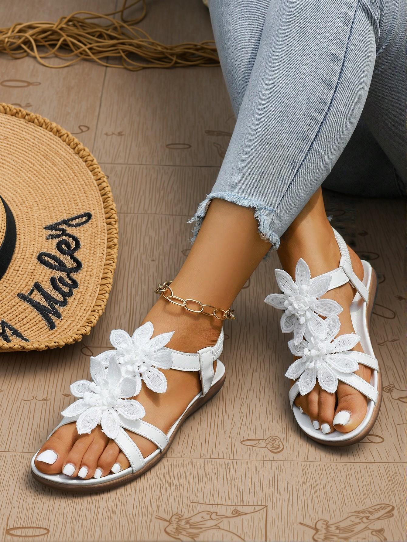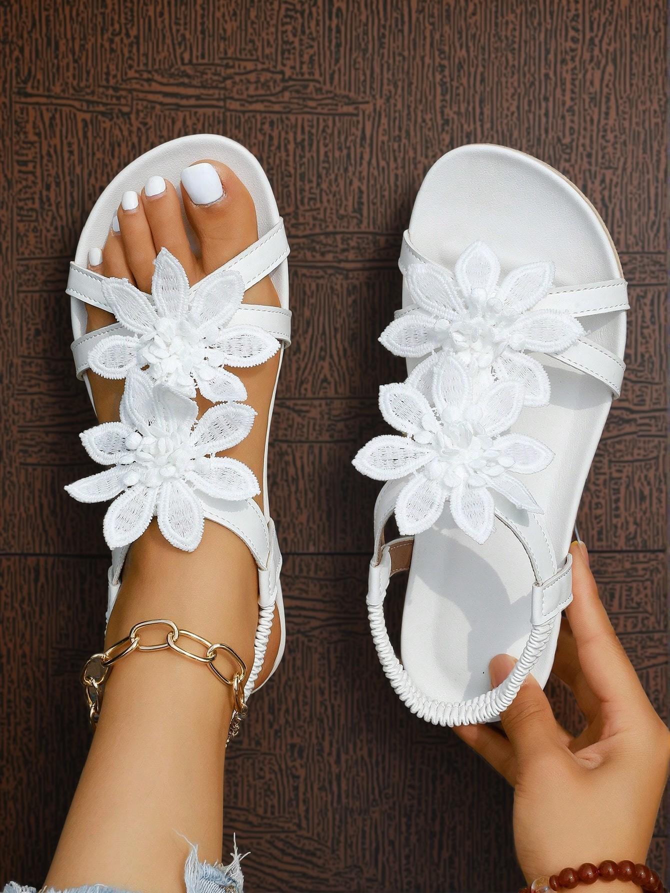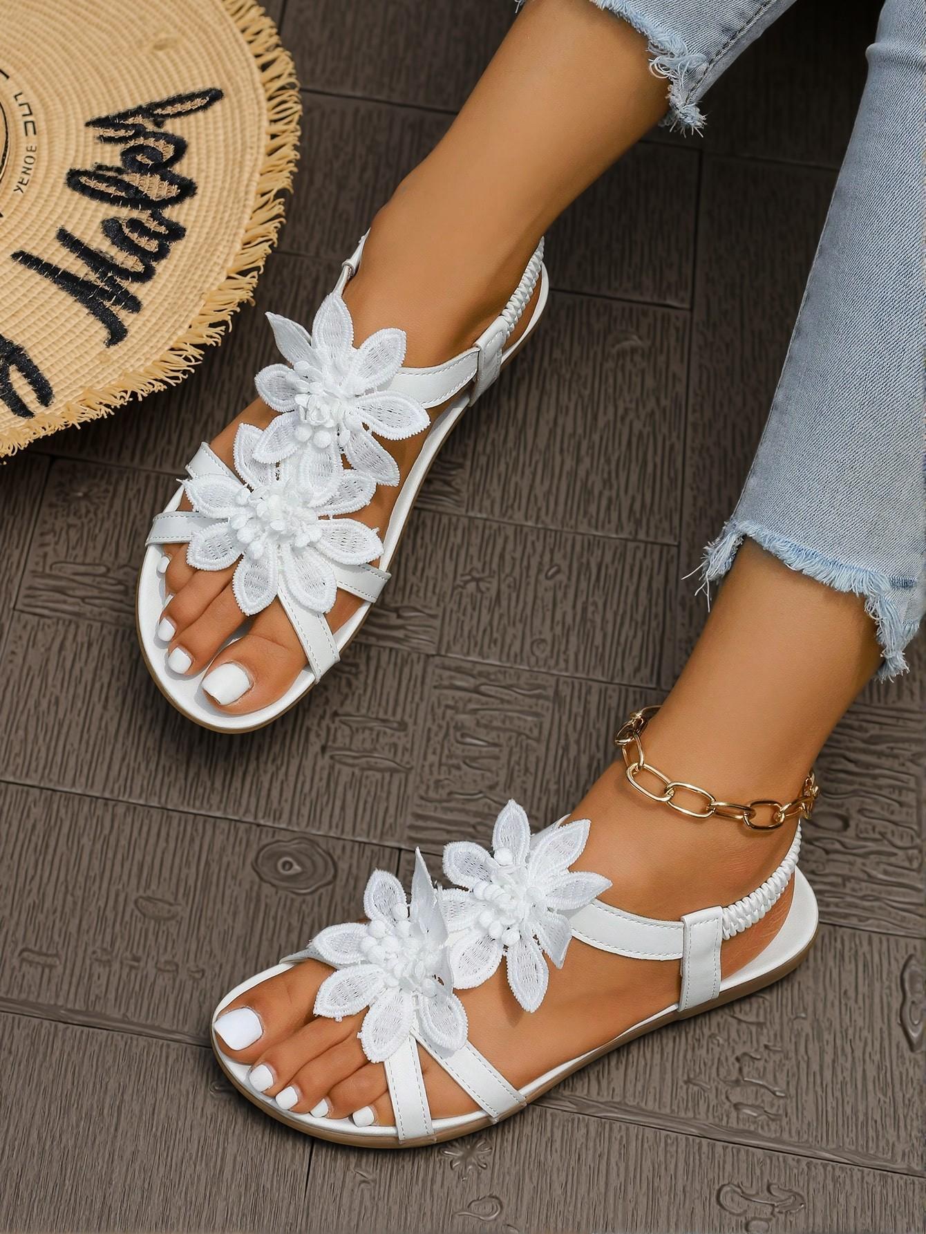 Elegant Cream White Women Flat Sandals with Floral Embellishments, Bohemian Style for Summer,...