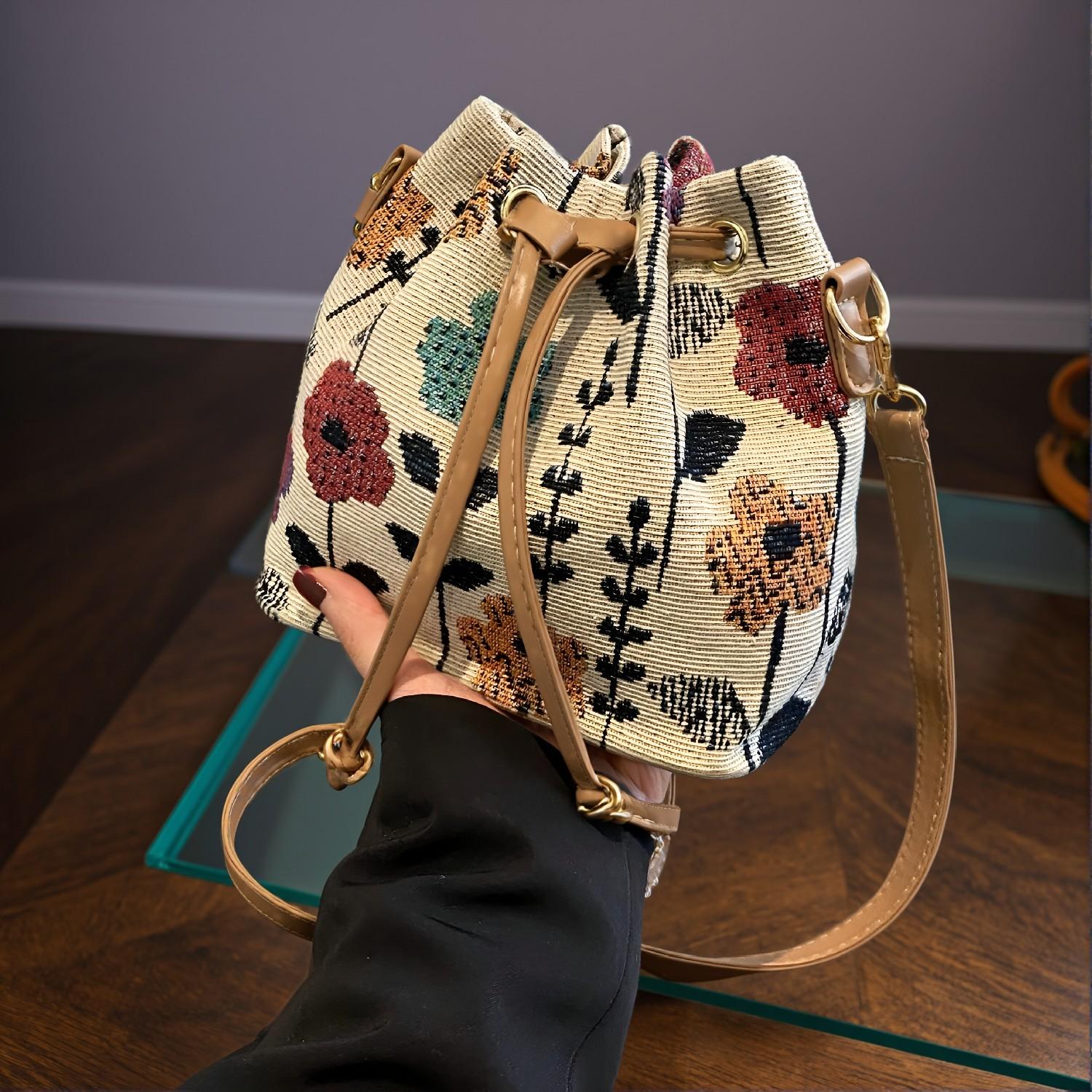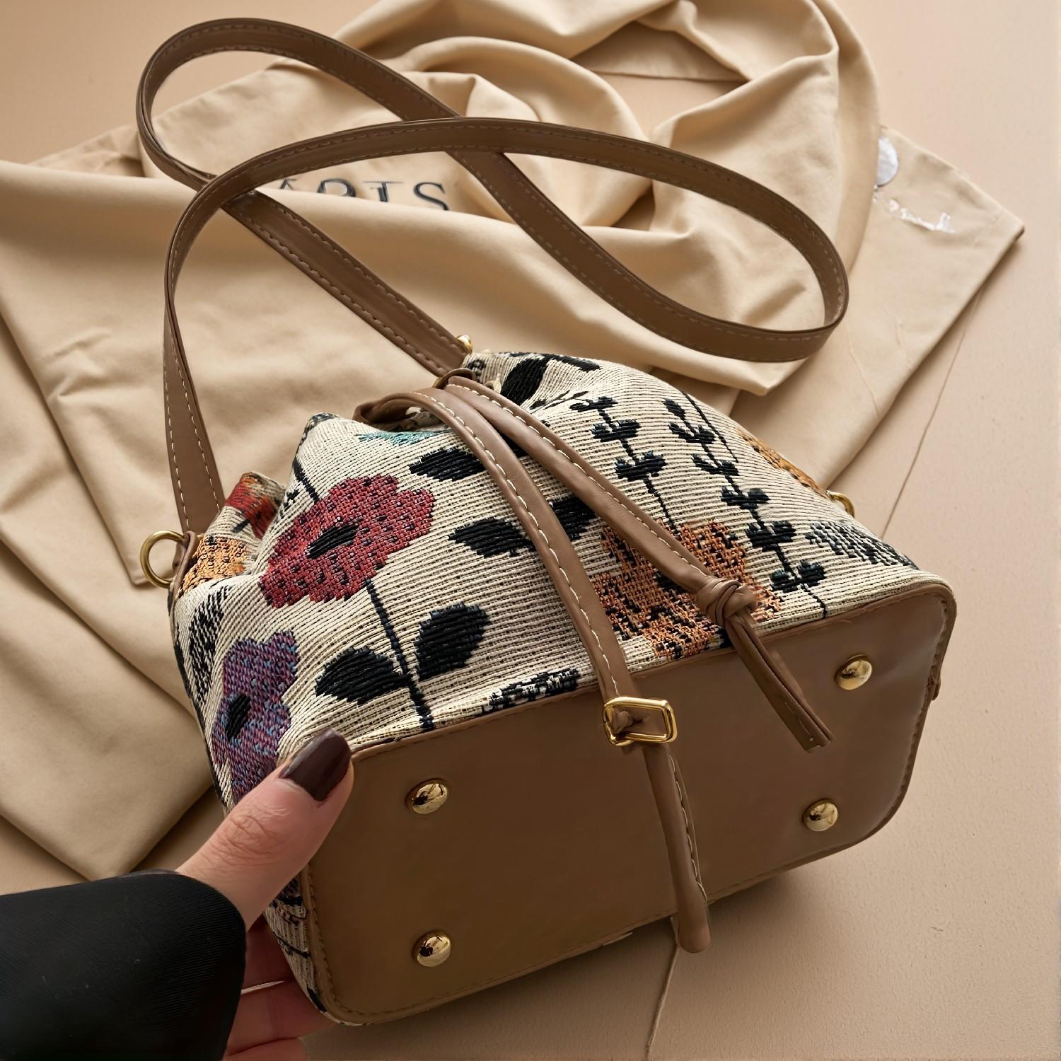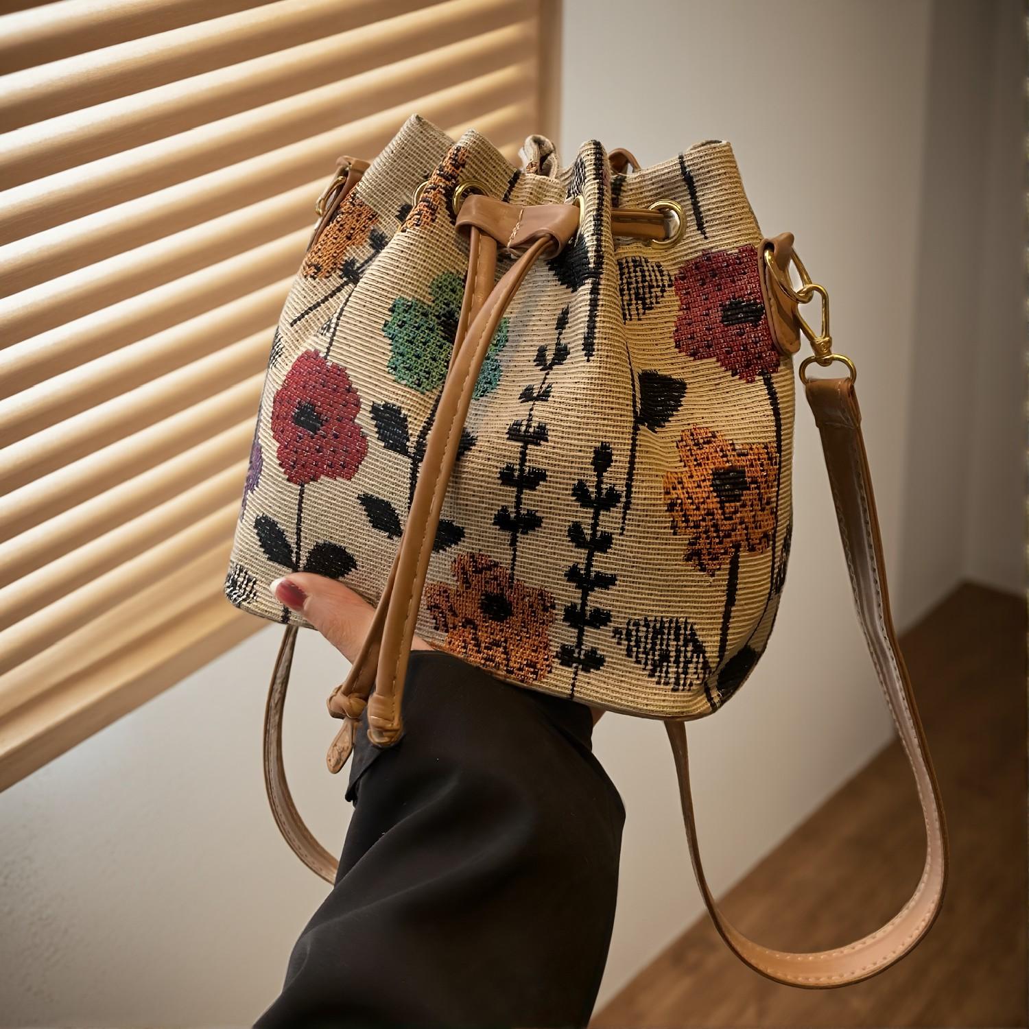 Elegant Floral Pattern Women’s Bucket Bag – Ethnic Style Handbag with Zipper Closure,...