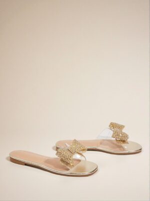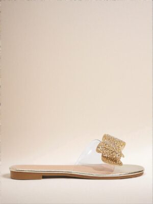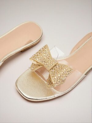 Introducing our Elegant Gold Women Flat Sandals – Stylish Slingback Slip-Ons with Bowknot and Crystal Embellishments for Summer Beach, Date, and Afternoon Tea. These sandals blend cuteness and comfort with an aesthetic that is both classy and chic. Perfect for summer, beach vacations, or a lovely afternoon out, these luxury sandals elevate any look with their trendy design and gorgeous gold finish.