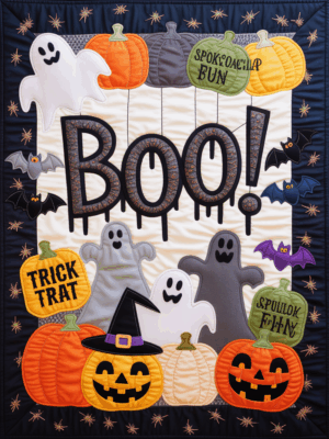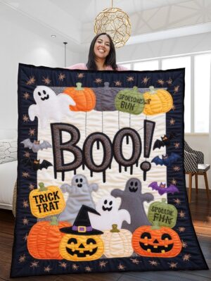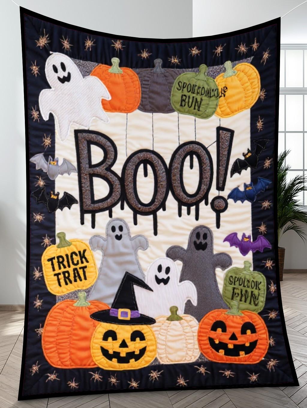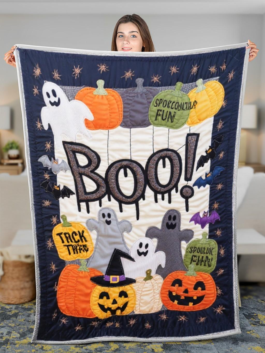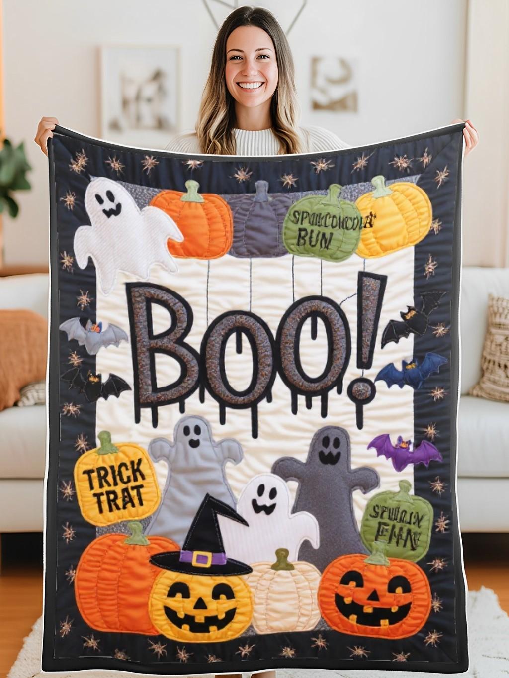 Elegant Halloween Quilted Blanket – Spooktacular Ghosts, Pumpkins & Full Moon Design...