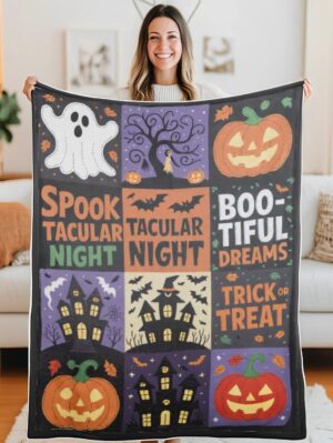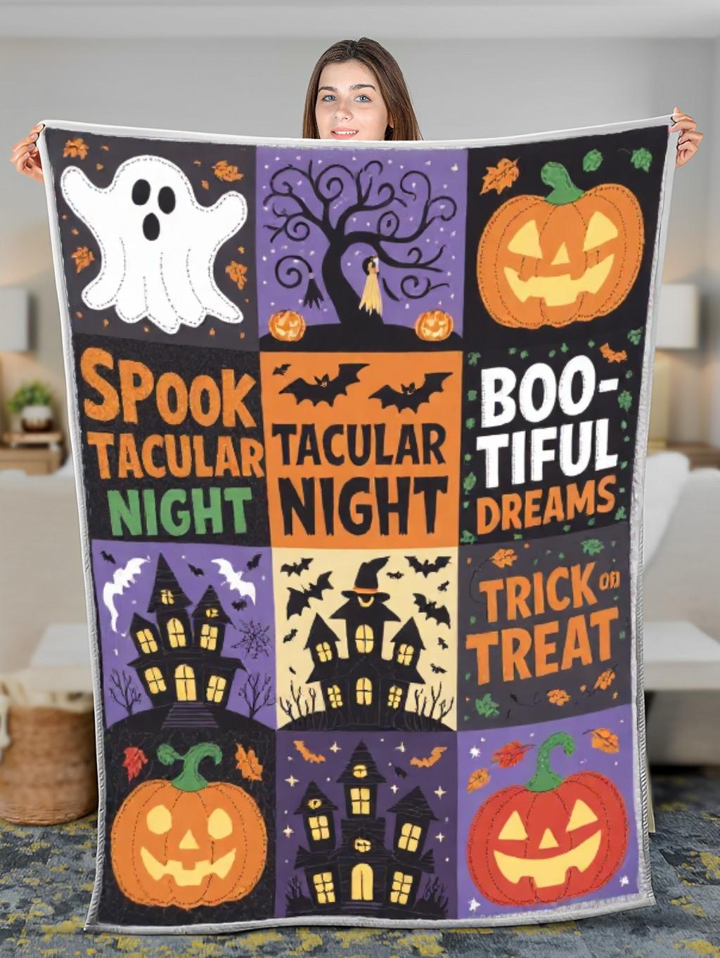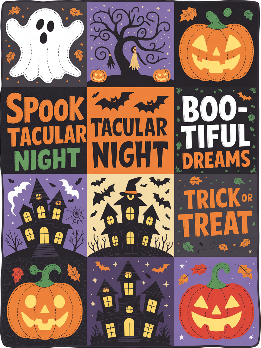 Elegant Halloween Quilted Blanket – Spooky Ghosts, Playful Pumpkins, Haunted Houses, and...