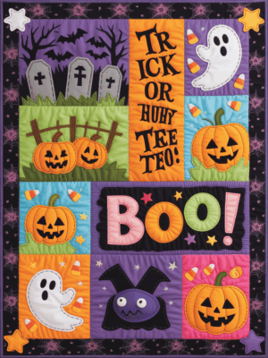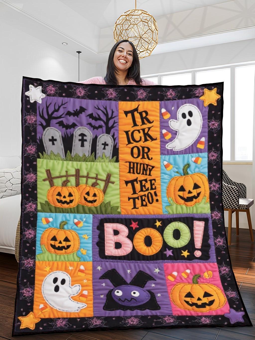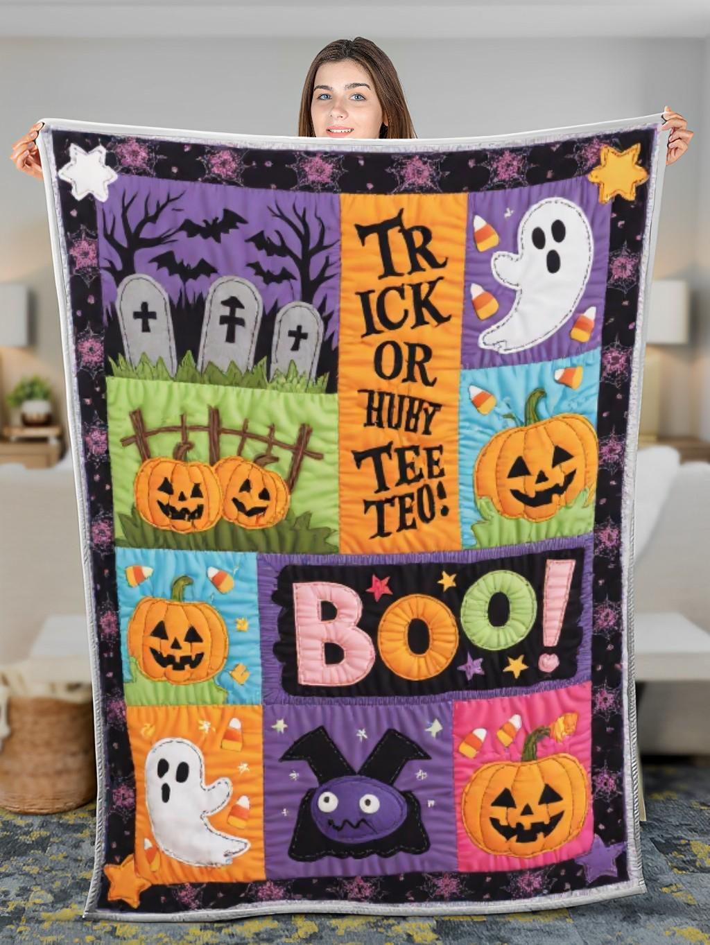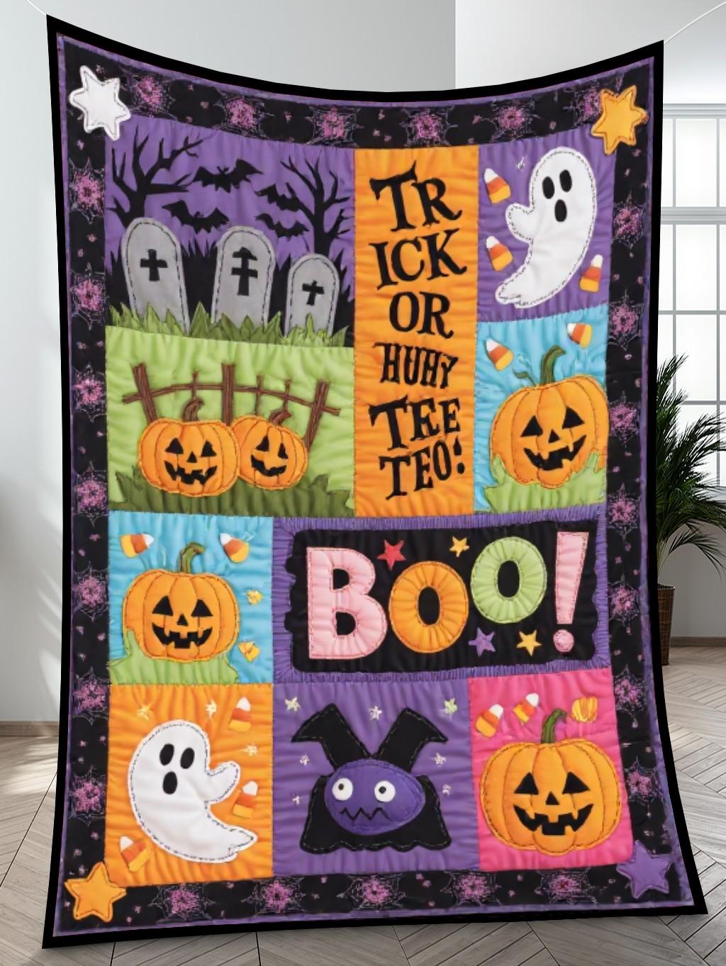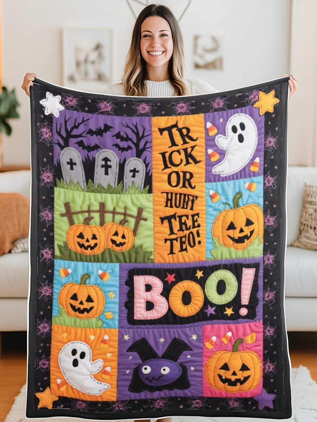 Elegant Halloween Quilted Blanket – Spooky Graveyard Scenes, Whimsical Ghosts, Pumpkins &...