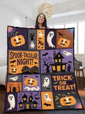 Elegant Halloween Quilted Blanket – Spooky Pumpkins, Haunted Houses, and Ghostly Ghouls with...