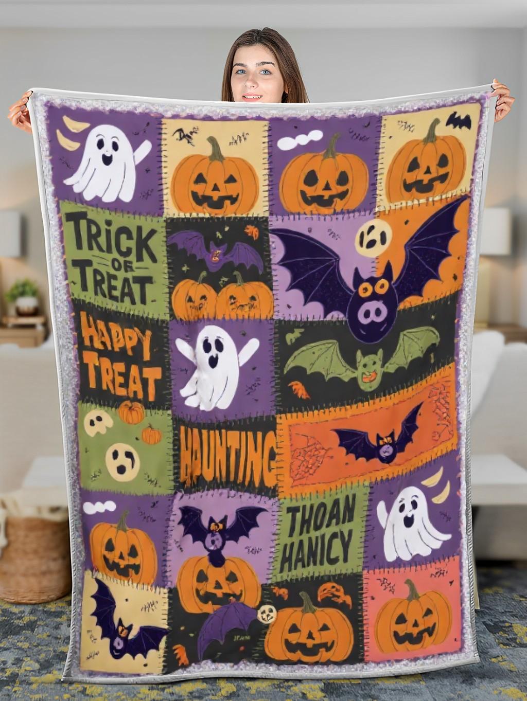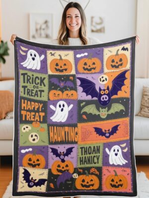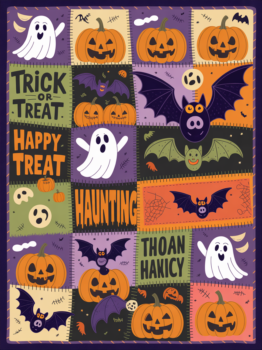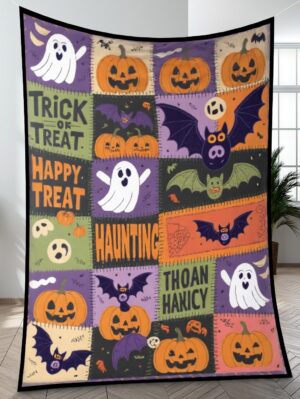 Elegant Halloween Quilted Blanket – Spooky Pumpkins, Whimsical Ghosts, and Overly Textured...