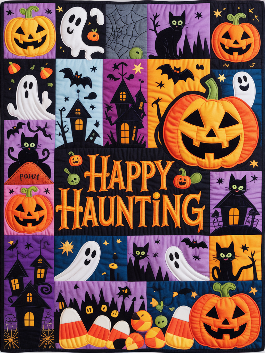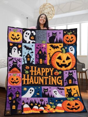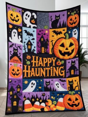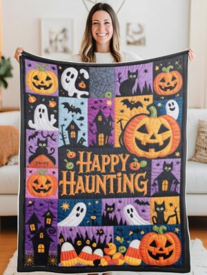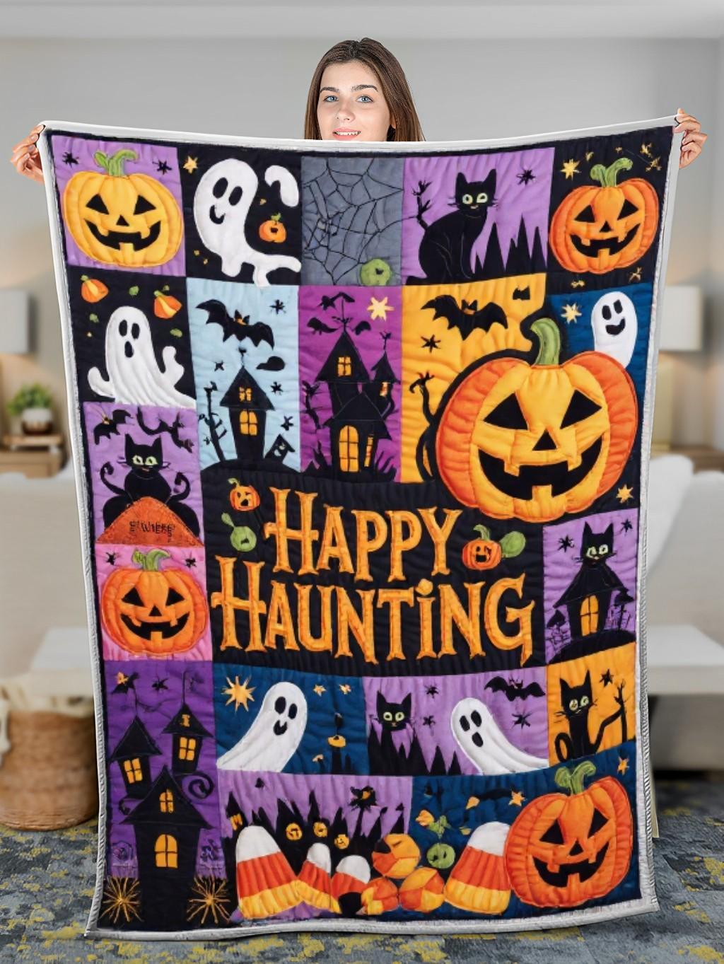 Elegant Halloween Quilted Blanket – Whimsical Ghosts, Playful Pumpkins, and Bewitched Bats...