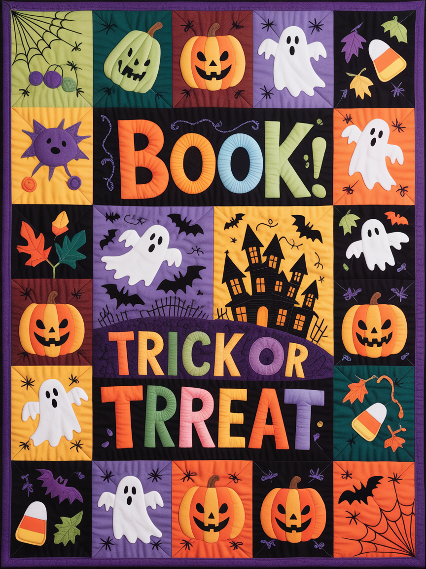 Elegant Halloween Quilted Blanket – Whimsical Patchwork of Pumpkins, Ghosts, and Spooky Silhouettes...