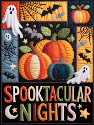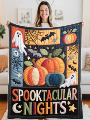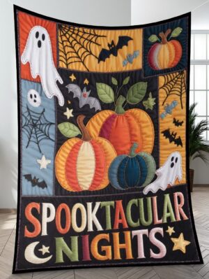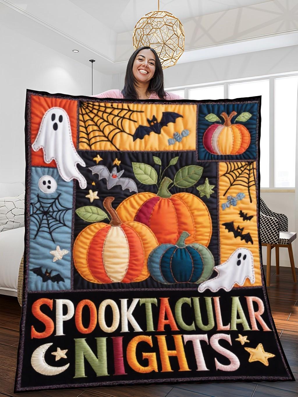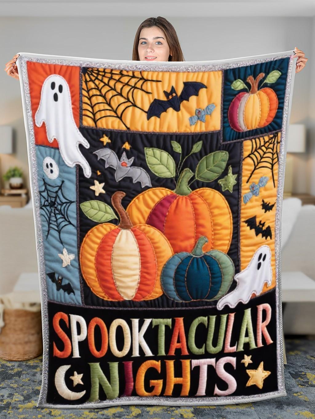 Elegant Halloween Quilted Blanket – Whimsical Pumpkins, Ghostly Ghouls, and Spooky Bats with...