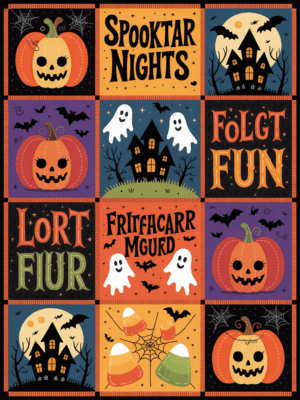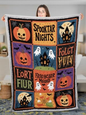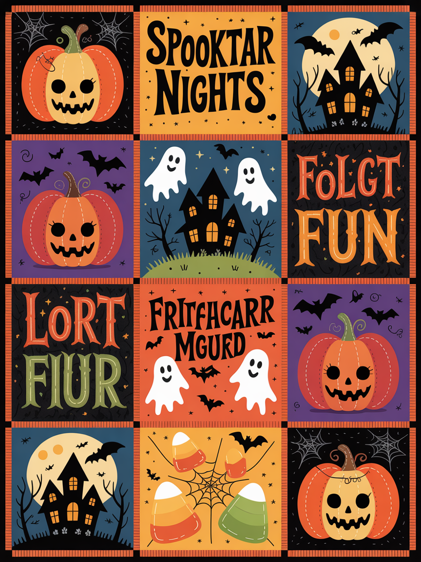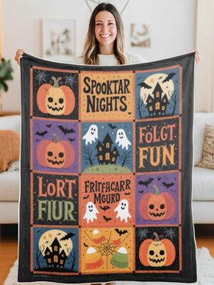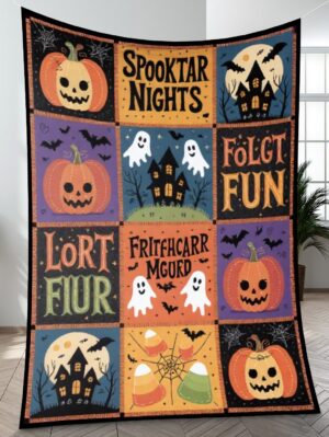 Elegant Halloween Quilted Blanket – Whimsical Pumpkins, Haunted Houses, and Spooky Silhouettes...