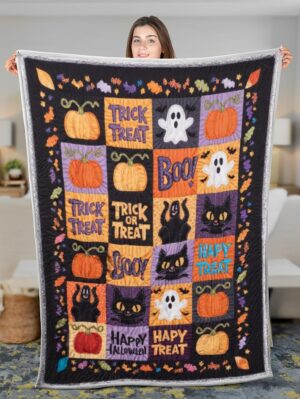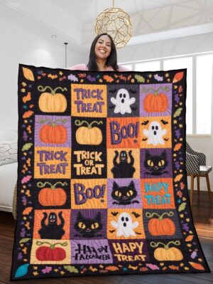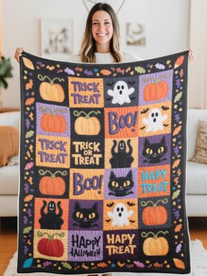 Elegant Halloween Quilted Blanket – Whimsical Pumpkins, Spooky Ghosts, and Bold ‘Trick...