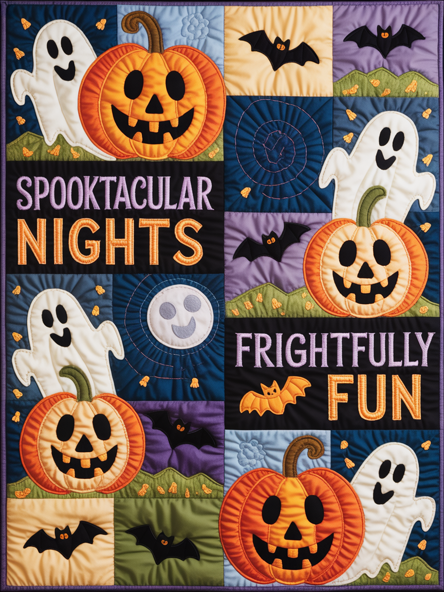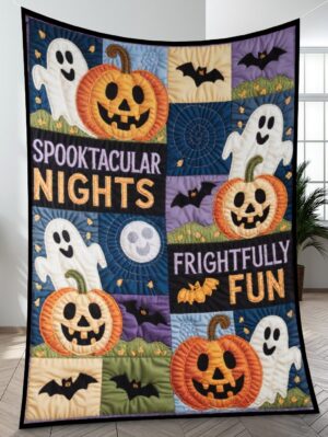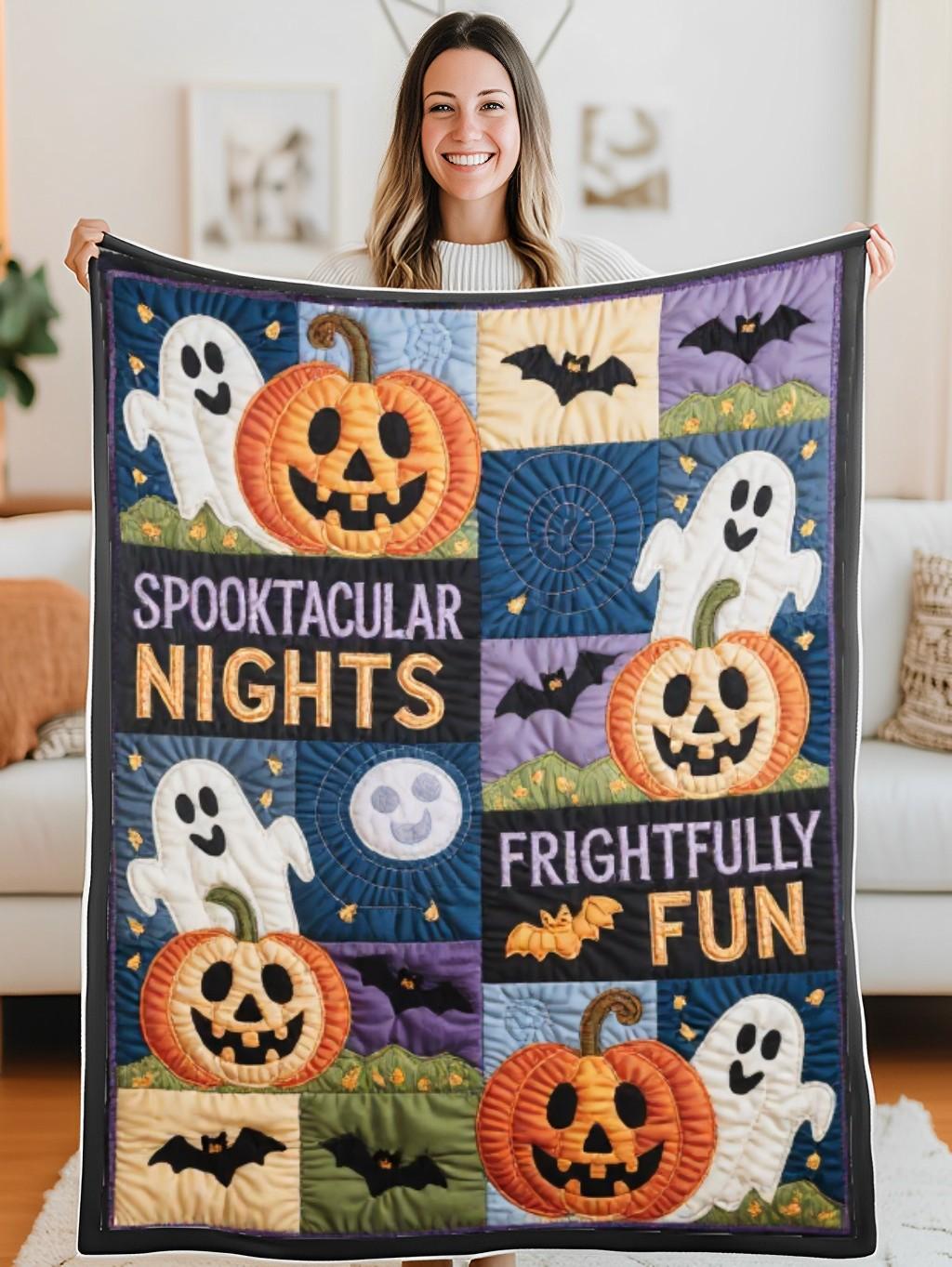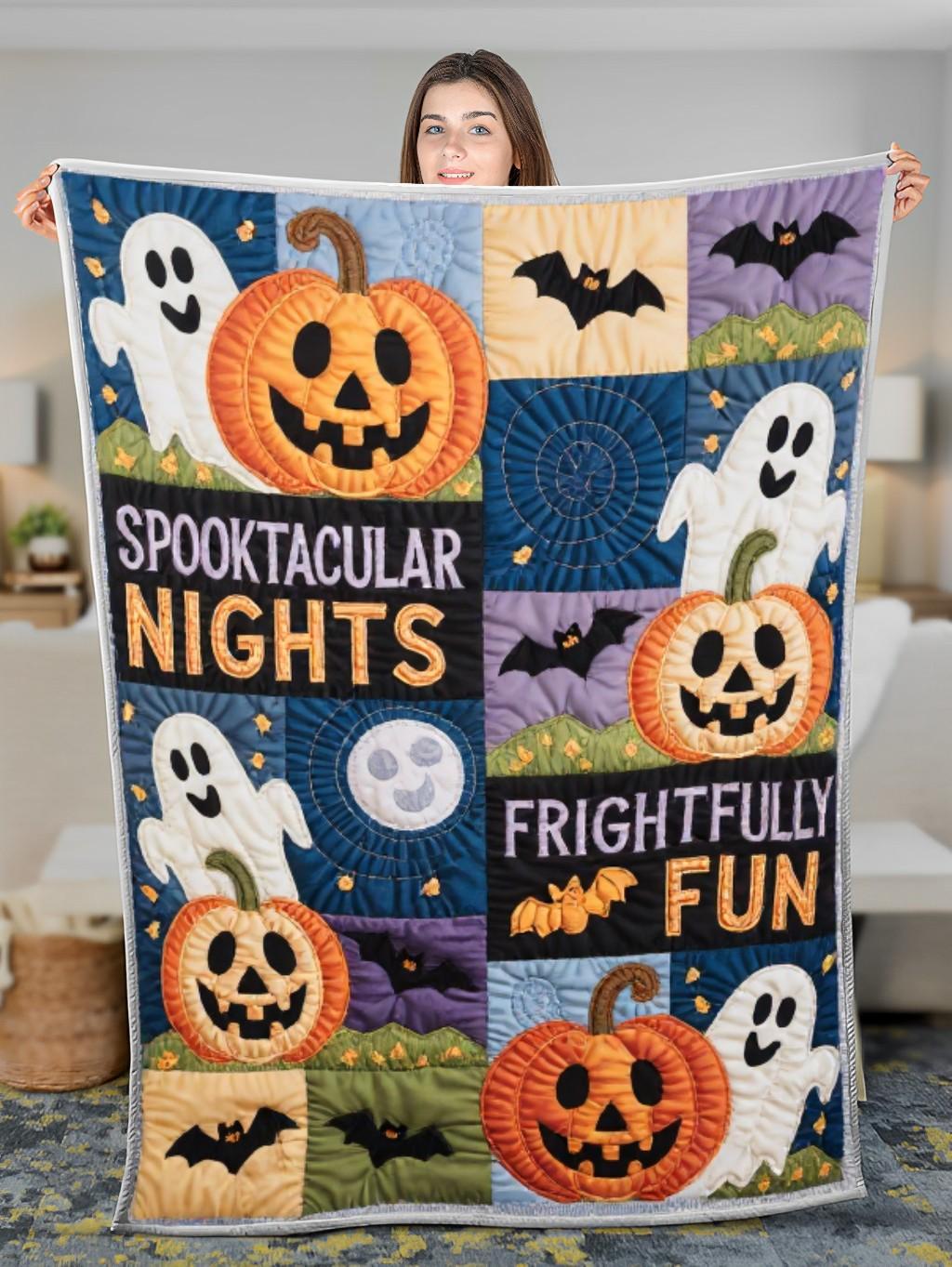 Elegant Halloween Quilted Blanket – Whimsical Pumpkins, Spooky Ghosts, and Moonlit Night...