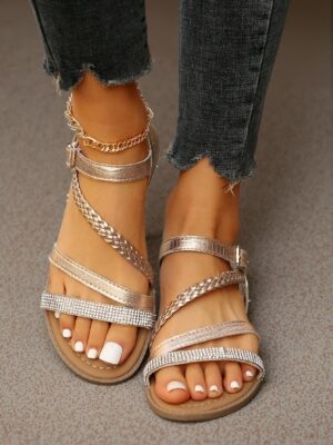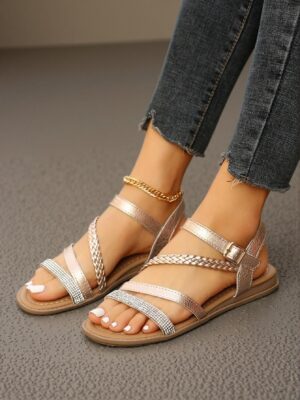 Elegant Rose Gold Women Flat Sandals Featuring a Chic Woven Snake Skin Design for Plus Sizes,...