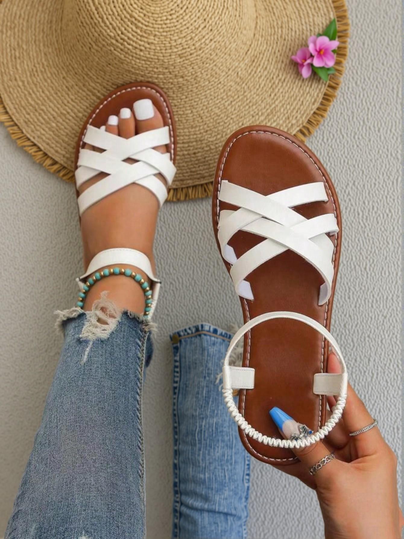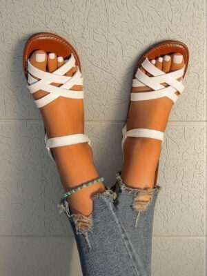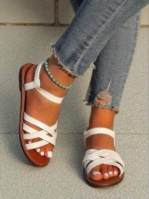 Elegant White Women Flat Sandals with Cross Adjustable Straps, Comfortable and Lightweight...