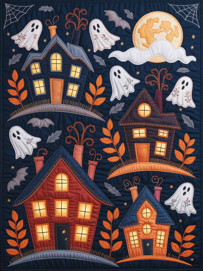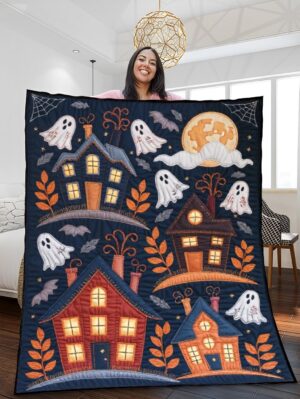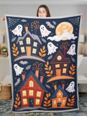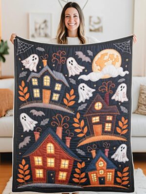 Haunted Houses and Ghosts Quilted Blanket – Spooky Folk Patchwork